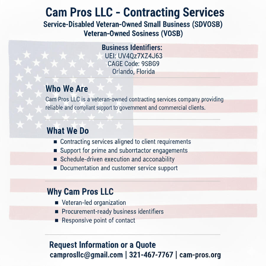 Elora serves as the primary customer-service representative for Cam Pros LLC, providing clear, dependable, and professional assistance to clients, partners, and government agencies. Trained in federal contracting communication standards, she ensures every inquiry is handled with accuracy, courtesy, and efficiency. Elora supports intake, project coordination, and service requests with a calm, solutions-oriented approach, helping clients navigate questions related to contracting, service delivery, and administrative support.Her role reflects Cam Pros LLC’s commitment to responsiveness, integrity, and mission-driven service as a Service-Disabled Veteran-Owned Small Business.